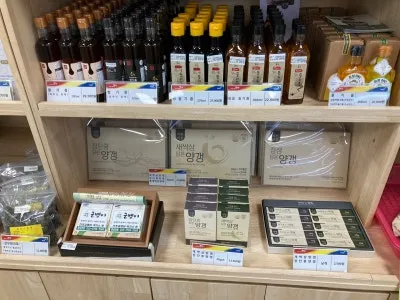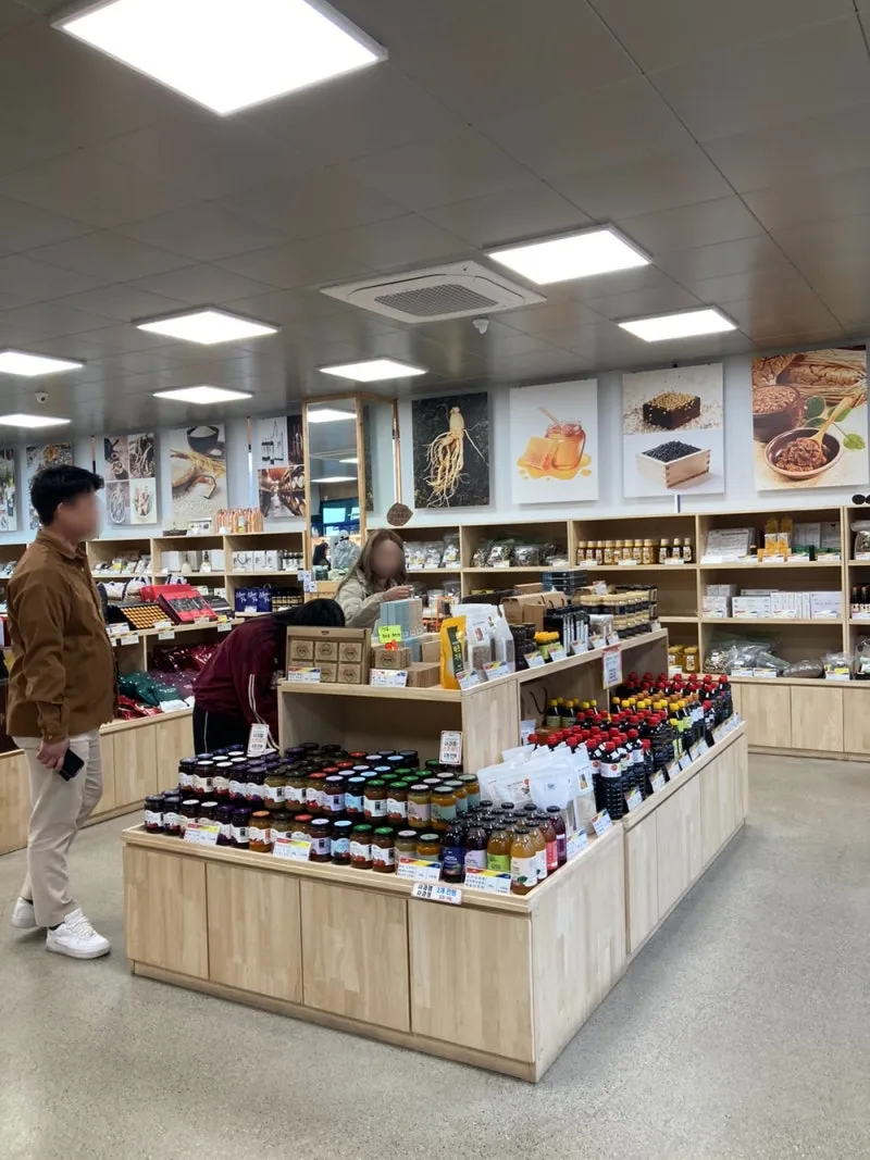 그들은 진열된 지역 특산품에 관심을 보이며 내용을 확인하고 조심스럽게 물건을 고릅니다.