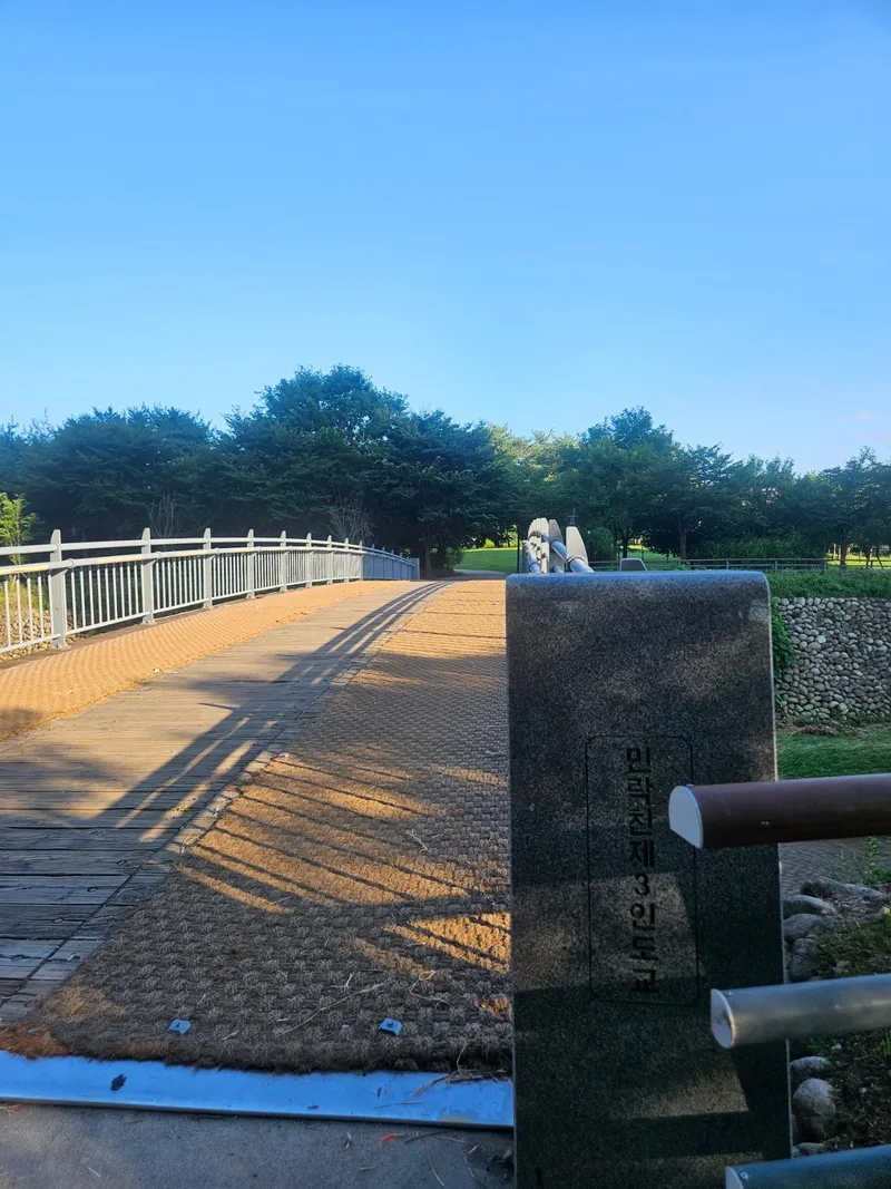 지하도를 지나면 오른쪽으로는 활기체육공원(축구장, 농구장.배드민턴장)과 쉼터공원이 있습니다. 활기체육공원 쉼터입앞에서 제3 인도교를 건너 왼쪽방향이 반려견 놀이터로 향하는 길입니다. 인도교를 건넌 후에는 계속 워킹로를 따라 걸으면 됩니다.