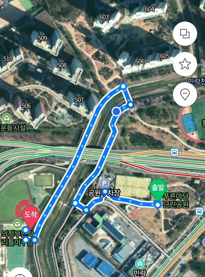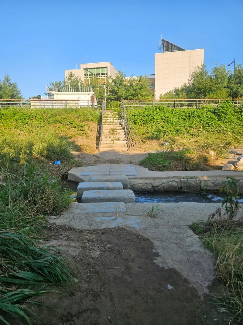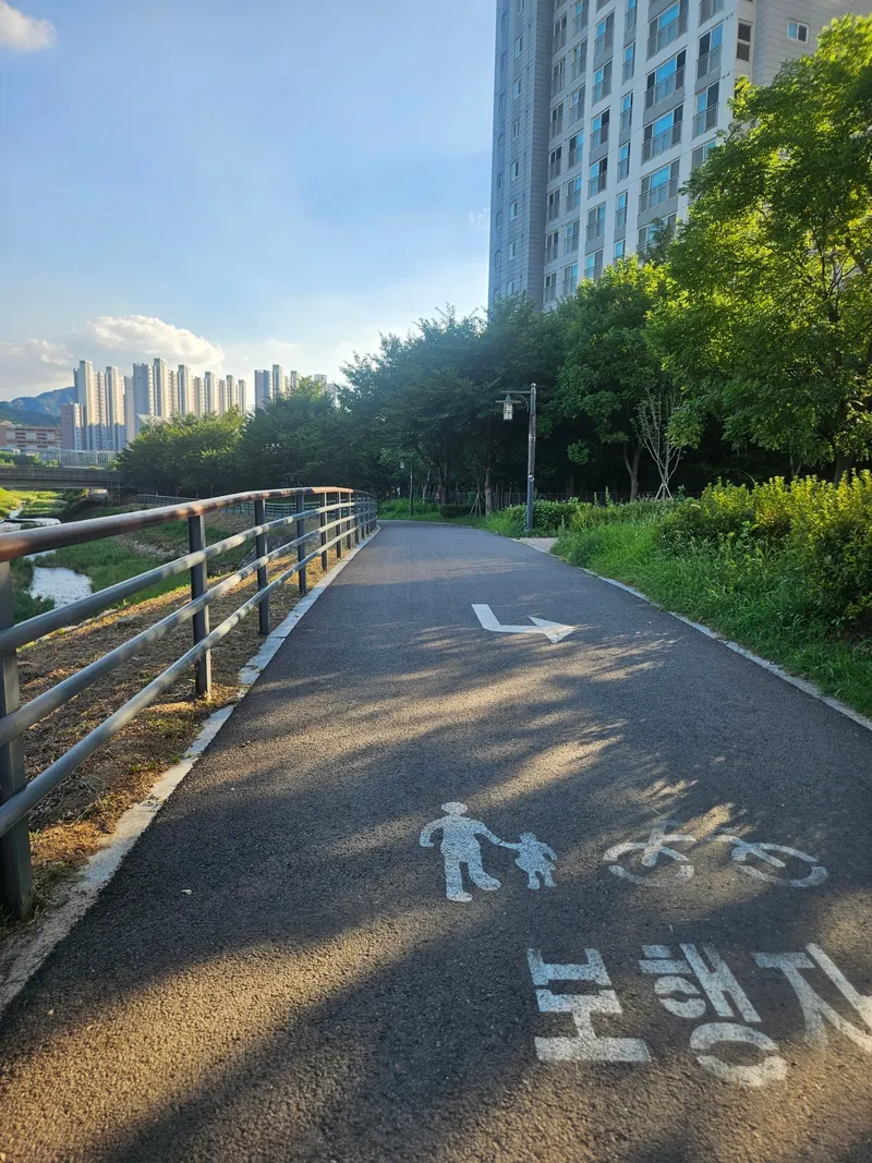 주차푸른마당근린공원에는 40여 대 정도가 주차할 수 있는 주차장이 있습니다. 주차장 입구 왼쪽에는 민락천 방향으로 가는 샛길이 있어요. 이 길을 따라 내려가면 민락천 워킹로가 나옵니다. 반려견 놀이터로 가는 길은 두 가지가 있는데요. 워킹로를 따라 제3 인도교를 건너 유보라 아파트 방향으로 돌아가는 길이 있고, 민락천 징검다리를 바로 건너가면 좀 더 빠르게 반려견 놀이터로 진입할 수 있습니다.