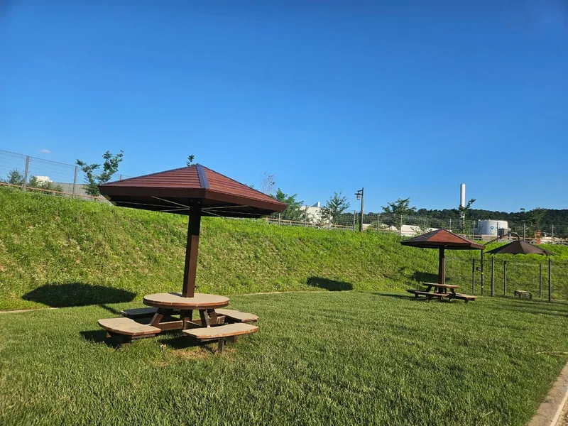 놀이터 중간중간 벤치와 그늘막이 설치되어 있어서 다른 반려견들과 교류하거나 휴식을 취할 수 있네요. 무엇보다 좋은 점은 주변에 주택 등이 가깝지 않아서 우리 강쥐들과 신나게 뛰어놀 수 있다는 것~~최고으 강점이죠.