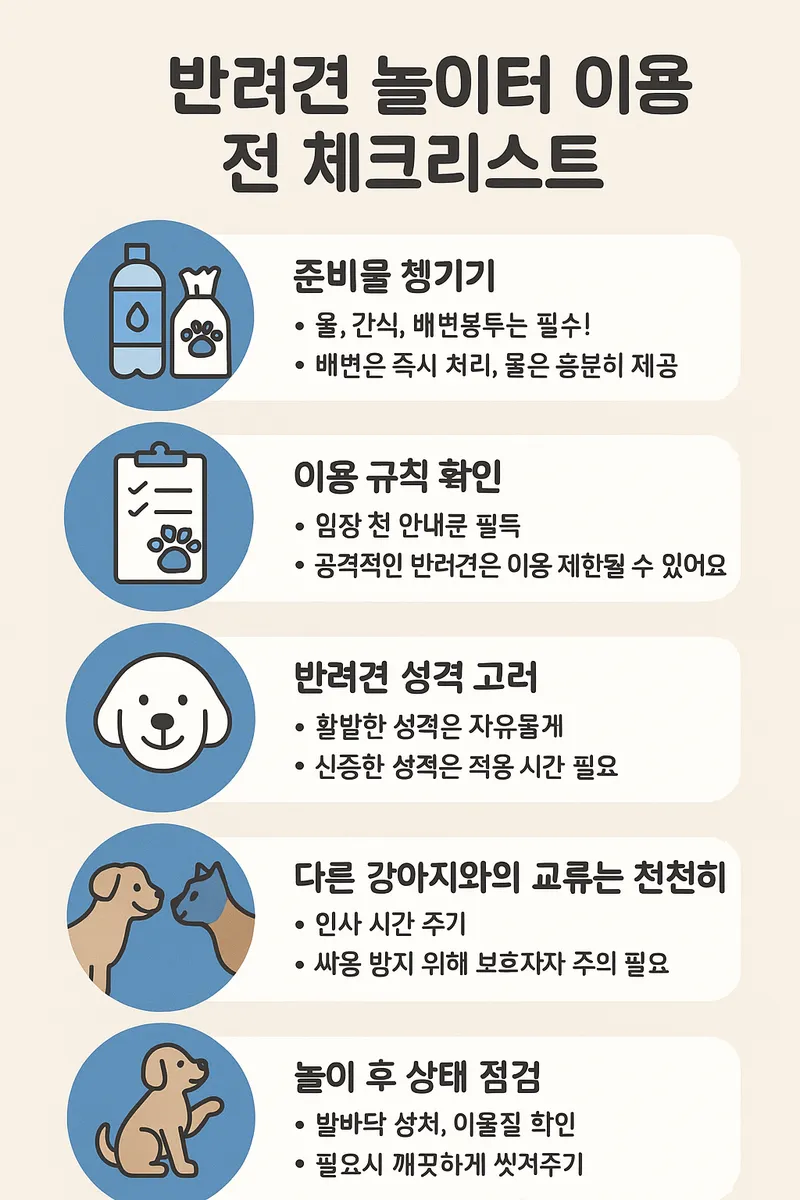 반려견 놀이터는 단순히 강아지들이 노는 공간이 아니라, 사람과 반려견이 함께 사회적 예절과 배려를 실천하는 소중한 공간입니다. 우리의 작은 마음가짐이 안전하고 행복한 놀이터 문화를 만들어갑니다.