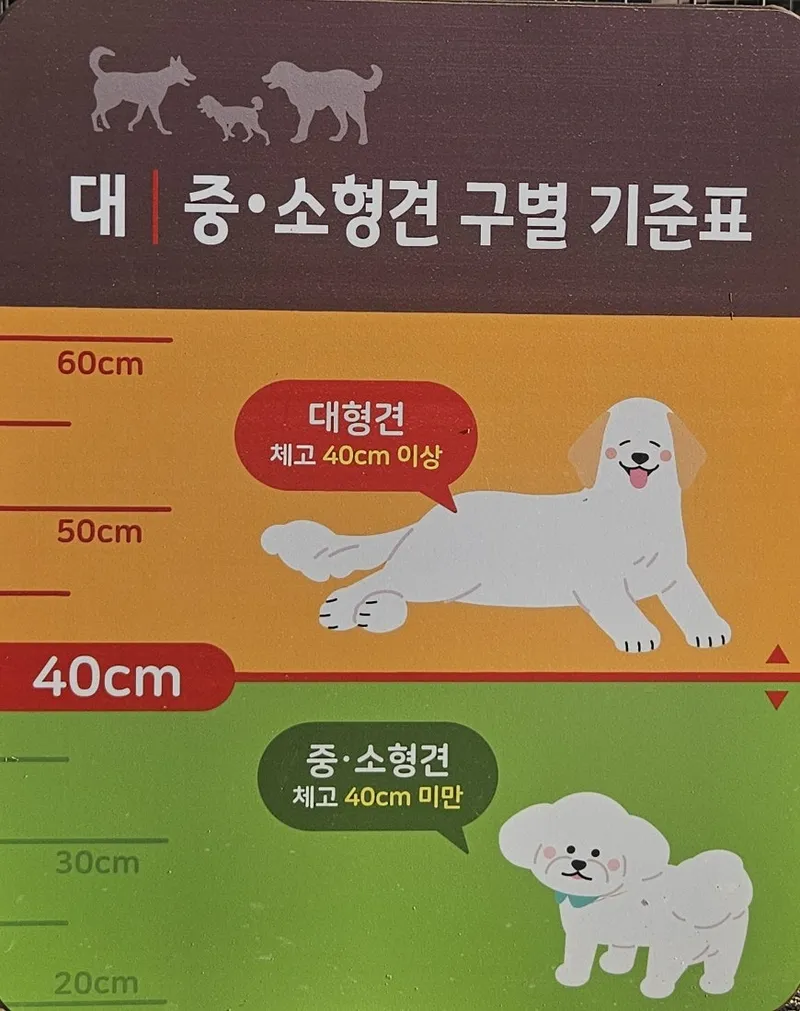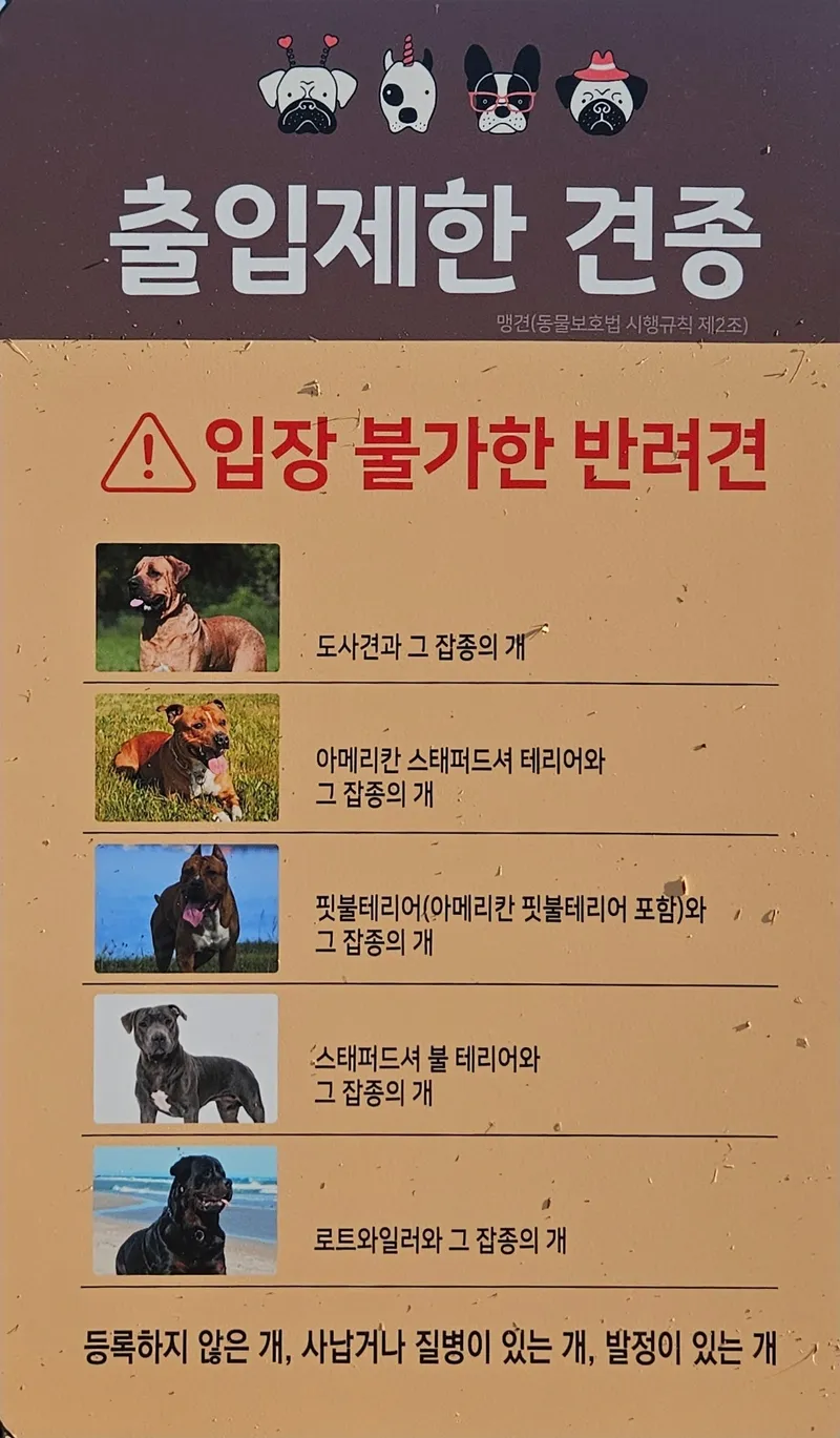 출입이 제한되는 견종도 있습니다. 등록되지 않는 개, 또는 사납거나 질병, 발정이 있는 개는 입장할 수 없답니다~