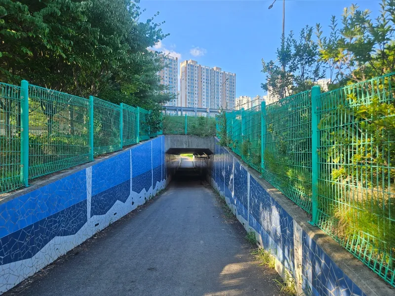 제3 인도교 방향 주차장에서 민락천 워킹로에 내려온 후 오른쪽에 바로 지하도 입구가 보입니다. 지하도 위는 민락동IC로 가는 사거리 근처입니다. 위로는 자동차들이 쌩쌩 달리고 있습니다~