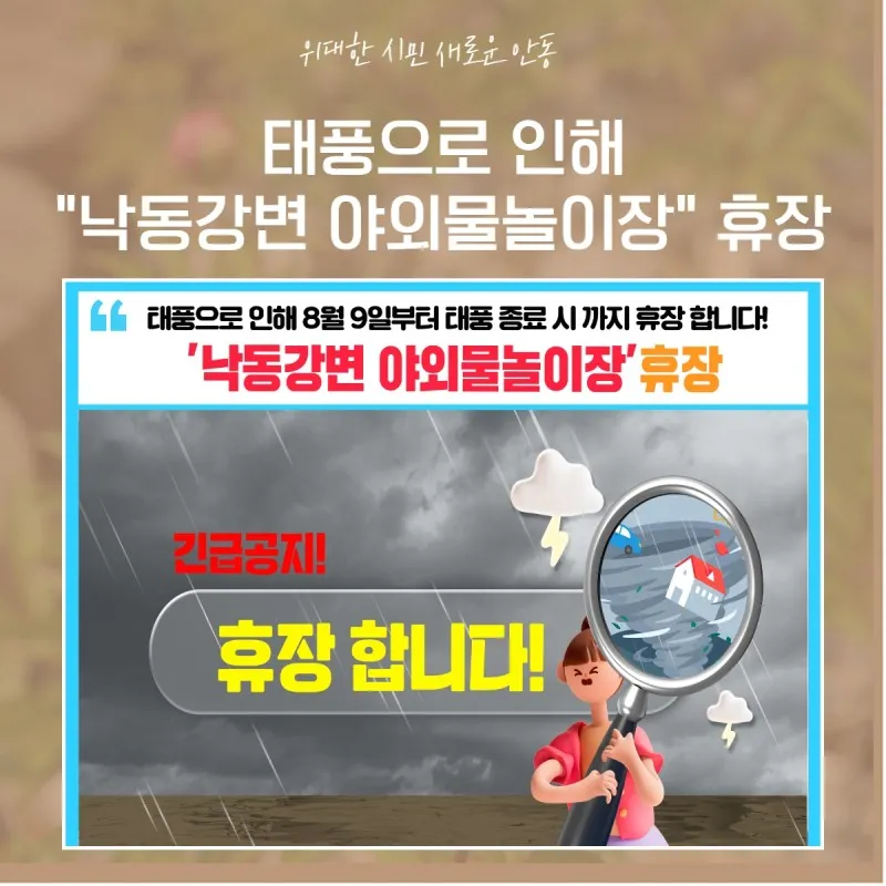 {"title":"📍 태풍으로 인해 \"낙동강변 야외물놀이장\" 휴장합니다.","source":"https://blog.naver.com/andongcity00/223178115736","blogName":"안동시 공..","blogId":"andongcity00","domainIdOrBlogId":"andongcity00","logNo":223178115736,"smartEditorVersion":4,"meDisplay":true,"lineDisplay":true,"outsideDisplay":true,"cafeDisplay":true,"blogDisplay":true}