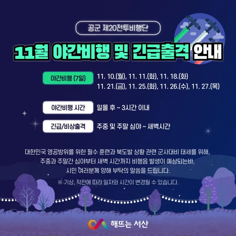 {"title":"2025년 11월 공군제20전투비행단 야간비행 긴급출격","source":"https://blog.naver.com/seosan_city/224067026332","blogName":"해뜨는 서..","domainIdOrBlogId":"seosan_city","nicknameOrBlogId":"서산지기","logNo":224067026332,"smartEditorVersion":4,"lineDisplay":true,"meDisplay":true,"blogDisplay":true,"cafeDisplay":true,"outsideDisplay":true}