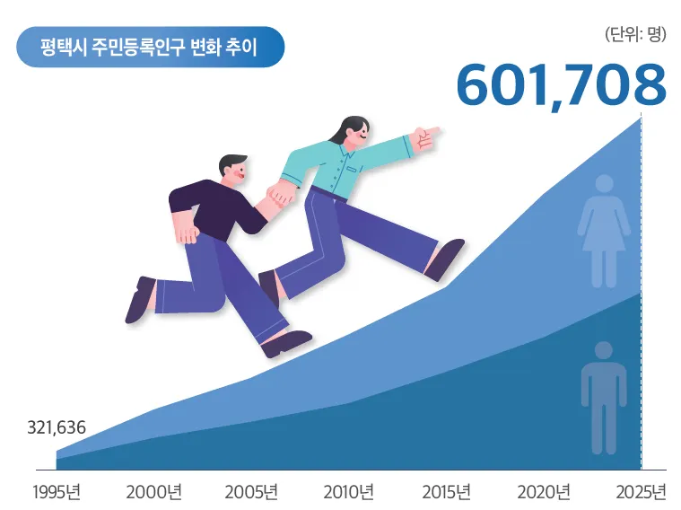 평택시의 인구는 1995년 3개 시·군이 통합된 이후 꾸준히 증가해 왔습니다.