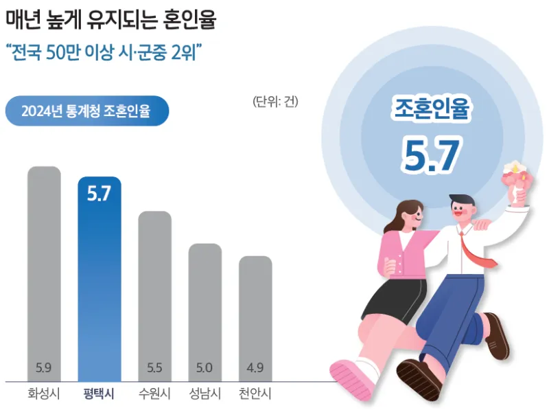 통계청의 ‘조혼인율’ 자료에 따르면, 2024년 평택시의 조혼인율은 인구 천 명당 5.7건으로,