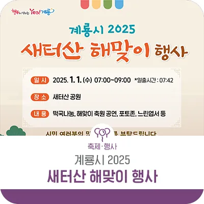 {"title":"계룡시 2025 새터산 해맞이 행사 안내!","source":"https://blog.naver.com/gyeryongcity1/223697444882","blogName":"계룡시청","blogId":"gyeryongcity1","domainIdOrBlogId":"gyeryongcity1","nicknameOrBlogId":"계룡시청","logNo":223697444882,"smartEditorVersion":4,"meDisplay":true,"lineDisplay":true,"outsideDisplay":true,"cafeDisplay":true,"blogDisplay":true}