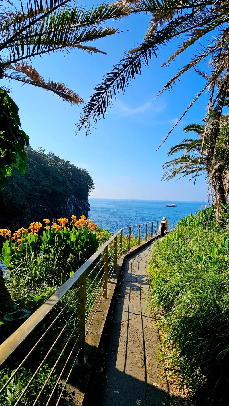 시계탑 오른쪽 작은 길을 따라 250m 정도 걷다 보면 폭포수 소리가 들리는 바다 방향의 데크길로 걸어갑니다.
