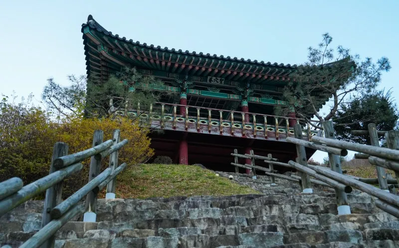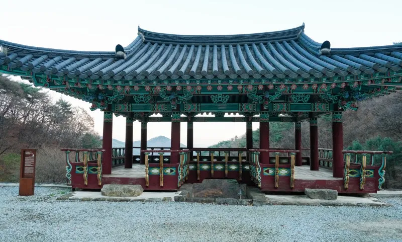 사찰 가장자리의 높은 곳에 자리한 이 누각은, 마루에 올라서는 순간 멀리 산 능선이 시원하게 펼쳐집니다. 단아한 누각의 아름다움과 탁 트인 전망이 어우러져 깊은 인상을 남깁니다.