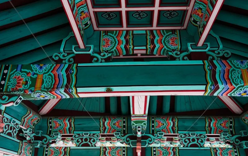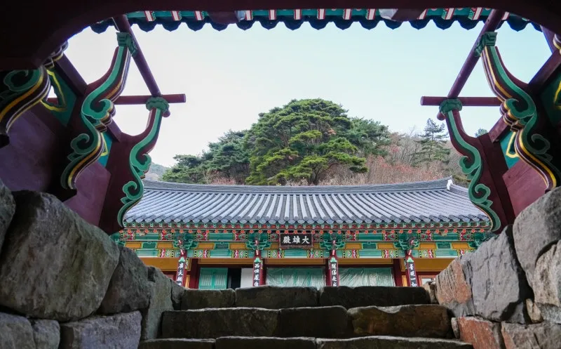 가장 안쪽에 자리한 ‘대웅전’은 사진처럼 좁은 돌계단과 작은 문을 지나야 비로소 모습을 드러냅니다. 문을 통과하며 시야가 트이는 그 순간, 다채로운 색채의 단청과 정갈한 기와지붕이 만들어내는 압도적인 첫인상이 눈앞에 펼쳐집니다.