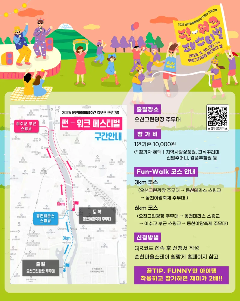 🏃➡️ 행사일시 25년 8월 30일 토요일 16:00 (* FUN - WALK 출발 시간ㅣ17:00) 🏃➡️ 행사장소 오천그린광장 및 동천, 동천야광축제장 일원 (* FUN - WALK 출발 장소ㅣ오천그린광장 주무대) 🏃➡️ 행사 내용 키다리 삐에로 풍선아트, 타투 체험, 나만의 레이스 소품 만들기, 버스킹공연, 끼쟁이 콘테스트, 펀런 패션왕, 레크레이션, 경품추첨 등 🏃➡️ 모집기간 25년 8월 22일 (금) 18:00까지 🏃♀️➡️ Fun-Walk 코스 안내 ➡️ 3km 코스 (오천그린광장 주무대 → 동천테라...