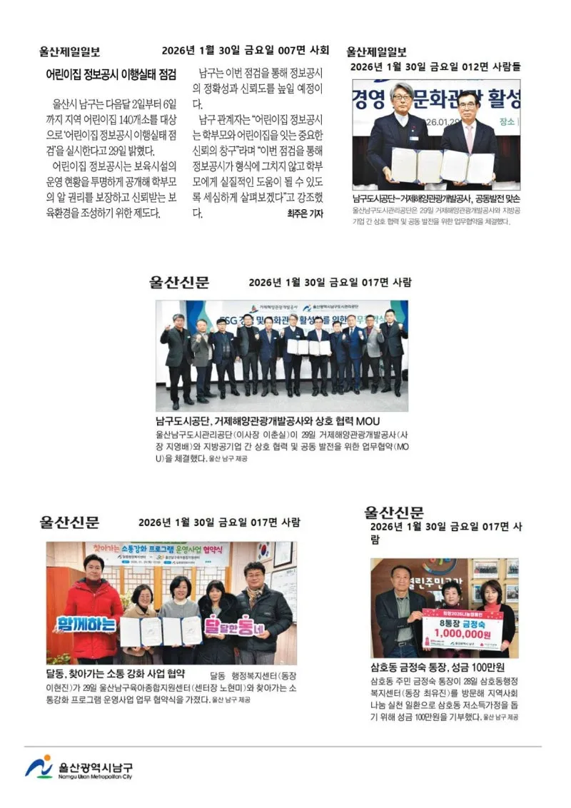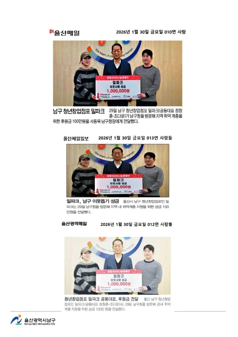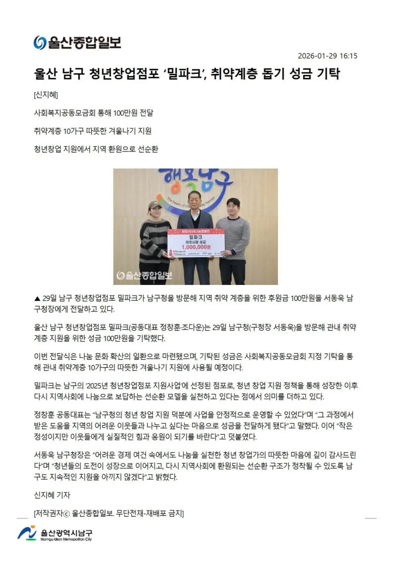 {"title":"[행복남구 오늘의신문] 이웃 돕기 온정 손길 남구 창업점포 밀파크 (1월 30일 금요일)","source":"https://blog.naver.com/ulsan-namgu/224165072049","blogName":"울산광역시..","domainIdOrBlogId":"ulsan-namgu","nicknameOrBlogId":"울산광역시남구청","logNo":224165072049,"smartEditorVersion":4,"blogDisplay":false,"cafeDisplay":false,"lineDisplay":true,"outsideDisplay":false,"meDisplay":true}