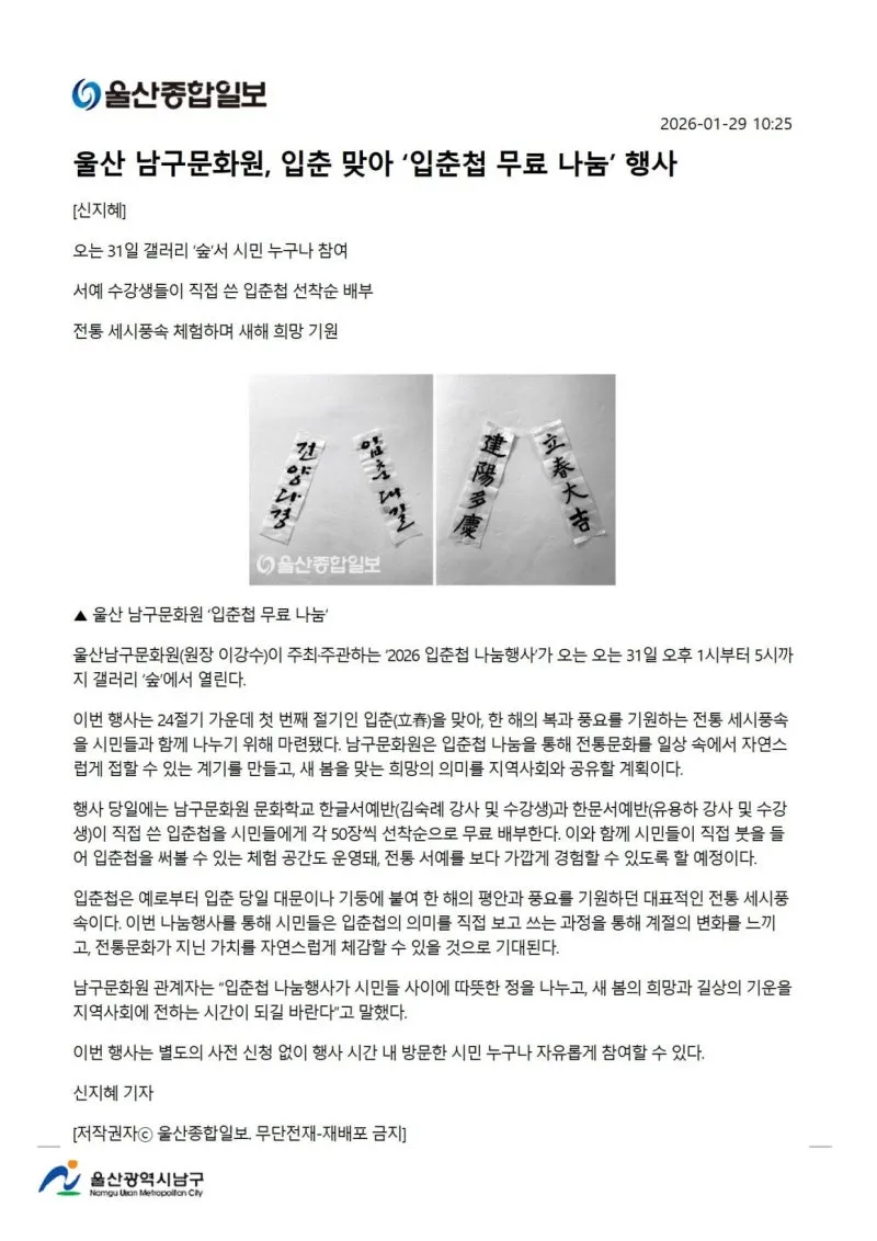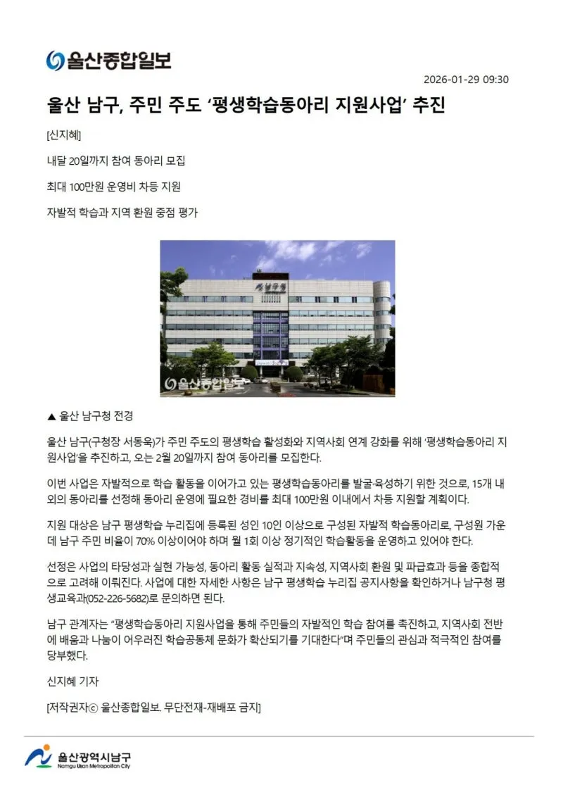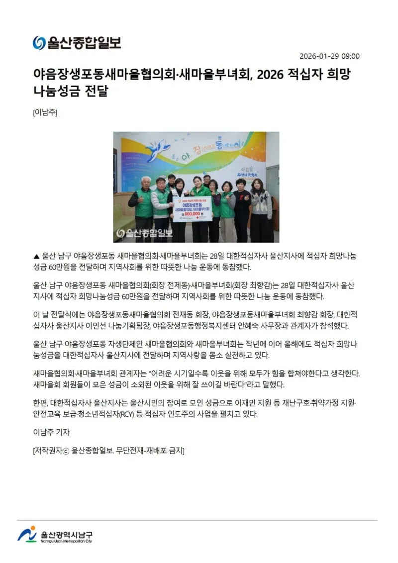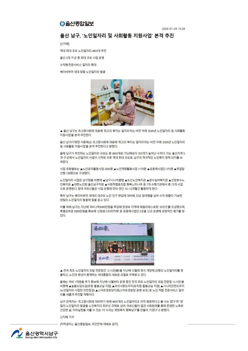{"title":"[행복남구 오늘의신문] 이웃 돕기 온정 손길 남구 창업점포 밀파크 (1월 30일 금요일)","source":"https://blog.naver.com/ulsan-namgu/224165072049","blogName":"울산광역시..","domainIdOrBlogId":"ulsan-namgu","nicknameOrBlogId":"울산광역시남구청","logNo":224165072049,"smartEditorVersion":4,"blogDisplay":false,"cafeDisplay":false,"lineDisplay":true,"outsideDisplay":false,"meDisplay":true}