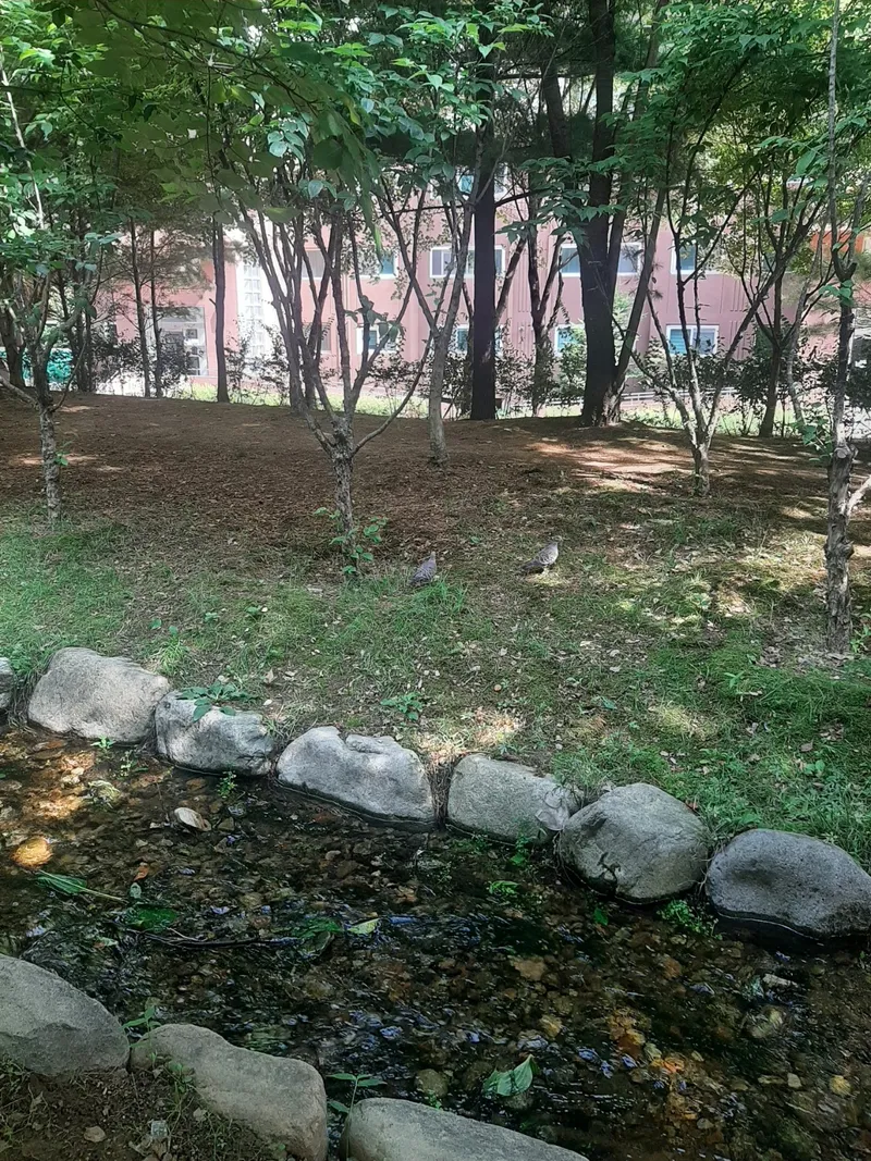 비둘기 두 마리도 더위를 피해 시원한 물소리가 들리는 곳으로 가까이 오고 있습니다. 근처에는 시원한 나무 정자가 있습니다. 잠시 앉아 주변의 여름 풍경을 느껴 보세요.