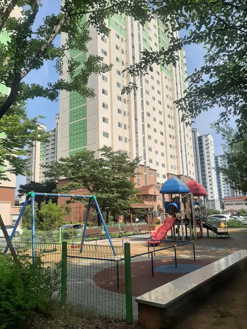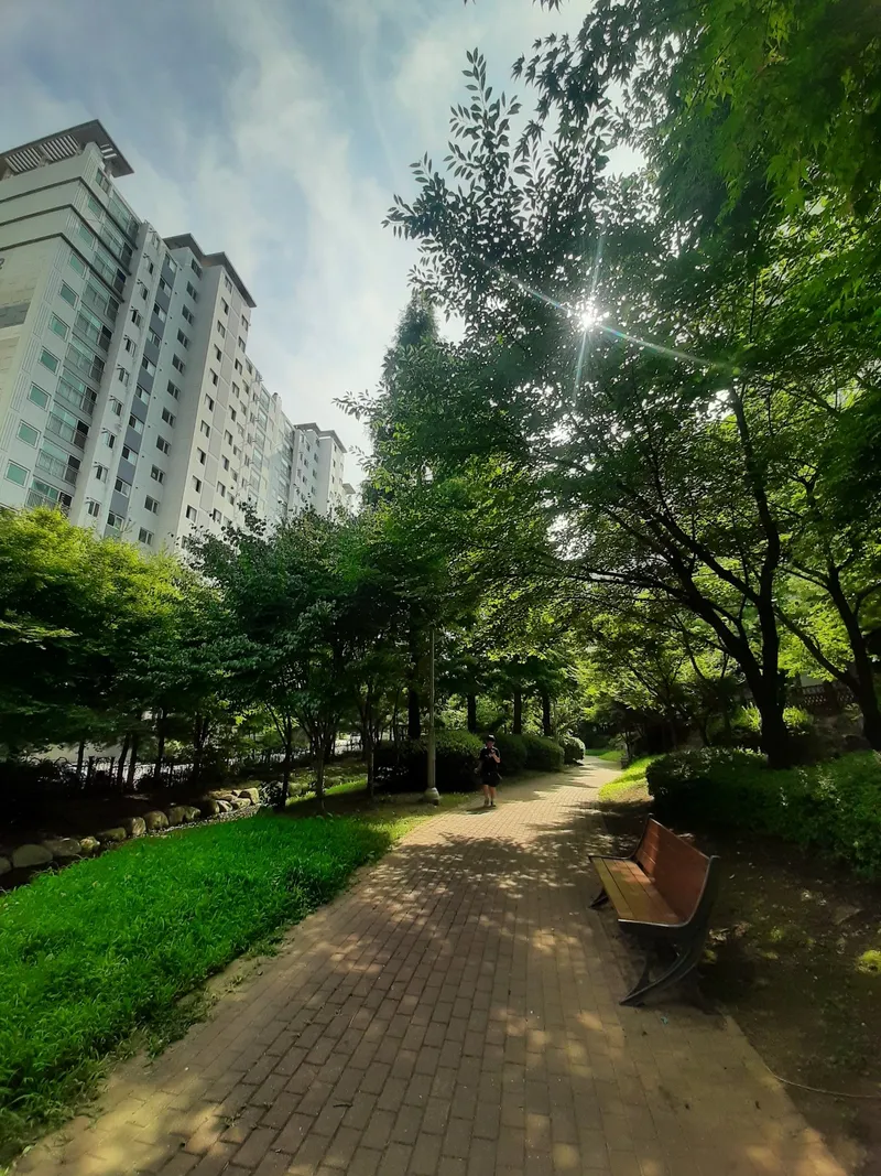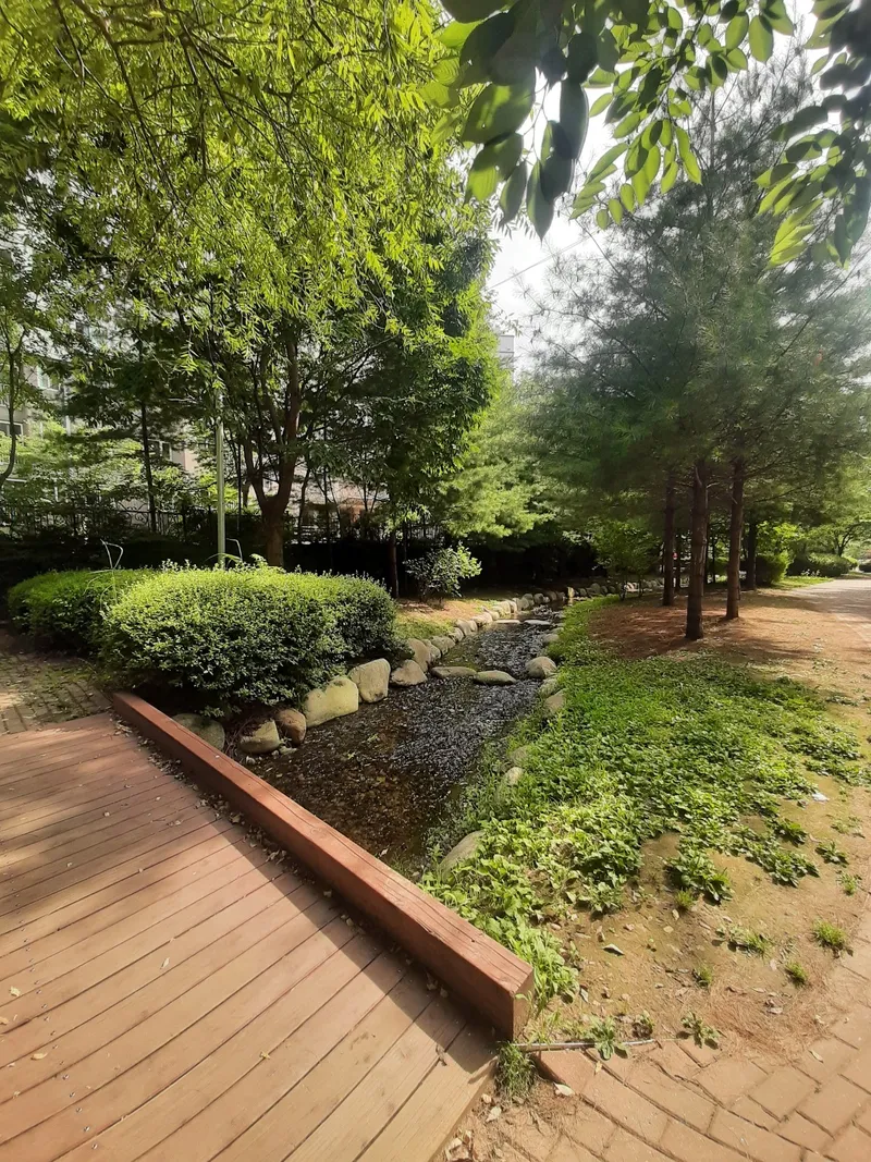 이안, 한내들 아파트 사이에도 경관형 수경시설이 이어져 있습니다. 하교하는 아이들부터 산책하는 하는 분들까지 이곳은 지나가는 분들이 많은 이유는 더운 여름날의 햇빛을 나무가 막아주고 있기도 하고, 쉬었다 가는 벤치가 여유 있게 마련되어 있기 때문이지요.