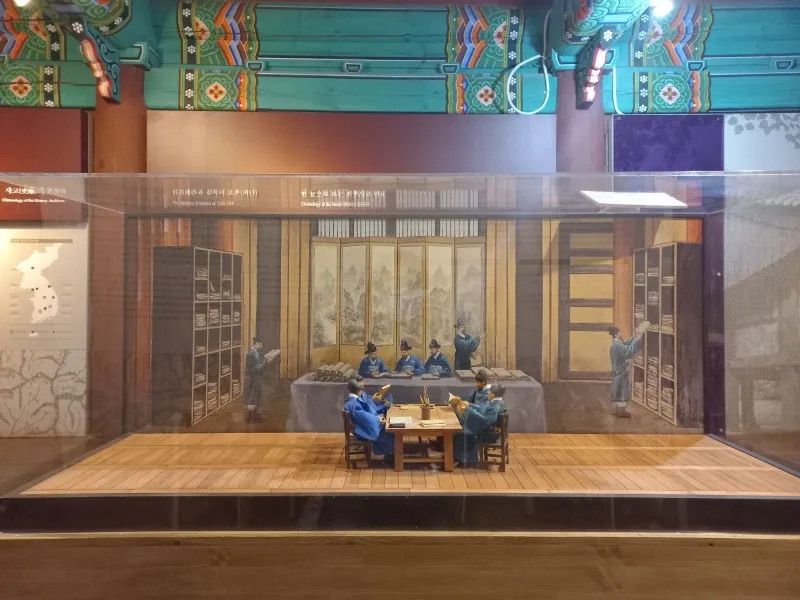 전주사고만 봐도 전각 형태의 목조건물입니다. 현대의 박물관이나 국가기록원을 방문해 보면 최첨단 시스템으로 온도와 습도를 조절하여 최적의 환경을 제공합니다. 조선시대 때는 2~3년에 한 번씩 정기적으로 사고를 찾아가 모든 실록을 꺼내어 한 장 한 장 넘기면서 습기를 말리는 작업을 하여 최상의 상태가 유지되도록 했다고 합니다.