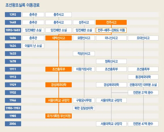 일제 점령기와 한국전쟁을 거쳐 현재는 서울대학교 규장각과 국가기록원 부산지원에서 보관하고 있으며 적상산사고의 실록은 한국전쟁 당시 북한에서 가져가 현재 김일성 대학에서 소장하고 있다고 합니다.