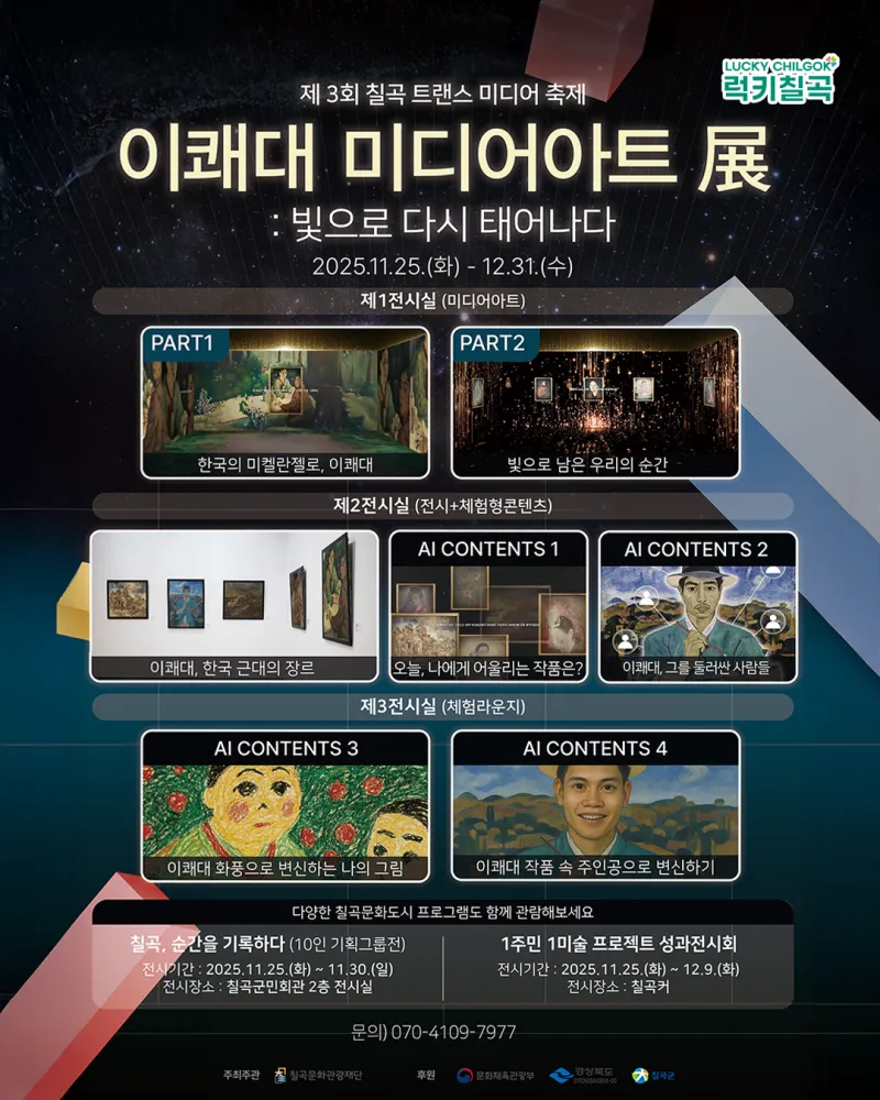 #칠곡군 #럭키칠곡 #칠곡트랜스미디어축제 #제3회칠곡트랜스미디어축제 #이쾌대미디어아트전시 #미디어아트전시 #칠곡공예테마공원 #아이와가볼만한곳 #겨울전시추천 #11월전시추천 #이쾌대전시 #주말가볼만한곳 #겨울방학명소 #칠곡핫플 #데이트코스 #대구근교데이트