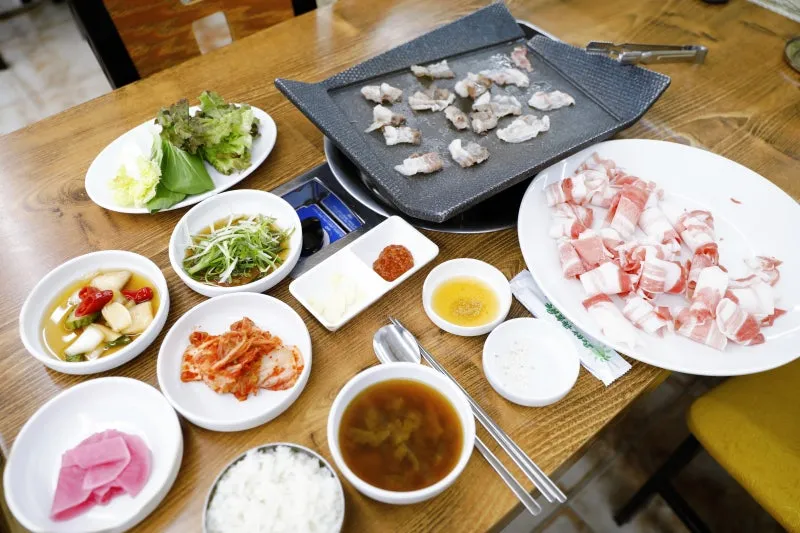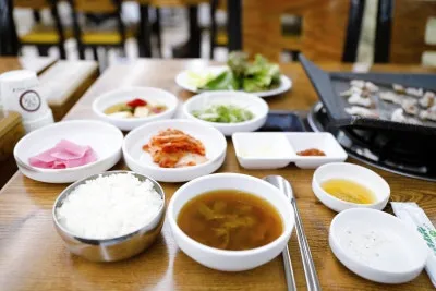 어느덧 식탁에는 고기와 밑반찬이 더해지니 밥상이 한결 풍성해졌습니다. 따뜻하고 구수한 시래기 된장국까지 제공되니 속이 더욱 든든합니다.