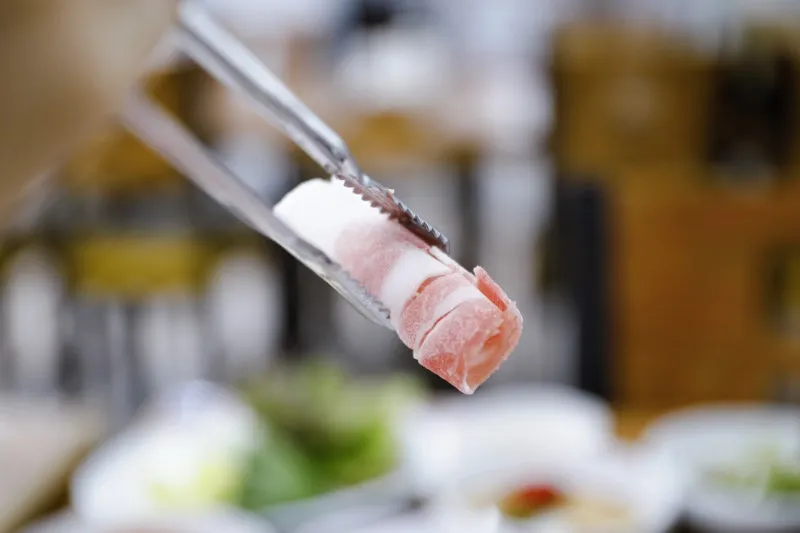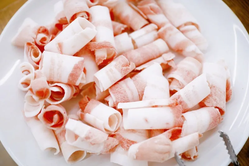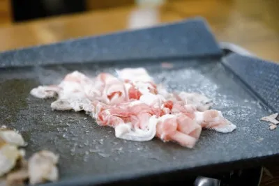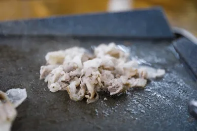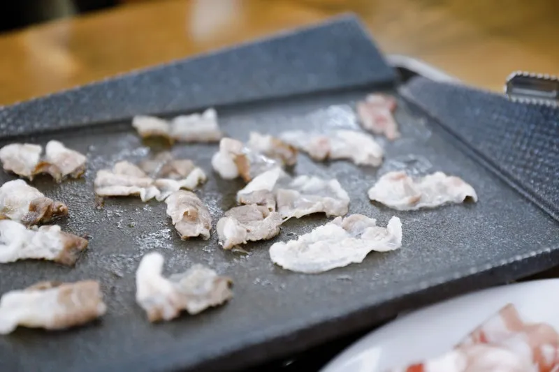대패삼겹살은 고기가 두껍지 않고 두께가 균일하게 일정해 불판에 올리면 금방 익습니다. 질기지 않고 부드러우며 기름기가 적당해 느끼함이 없어요.