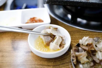 첫입은 고기 본연의 맛을 위해 먹고, 이후 참기름 양념장에 찍어 먹어봤습니다. 고기가 맛있어서 어떤 조합이든 맛있단 소리를 외치게 됩니다.