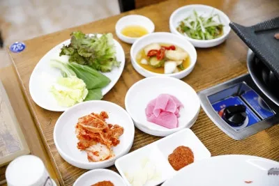 저는 메뉴가 나오는 사이, 막간을 이용해 신선한 쌈채소와 각종 반찬 및 소스류를 담았어요. 이때 먹을 만큼만 덜어 먹는 센스는 아시죠? 음식물 쓰레기를 줄임으로서 탄소 절감에 동참해 주세요.