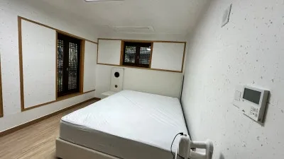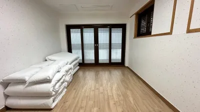 한 방에는 더블침대가 다른 방에는 이불, 요,