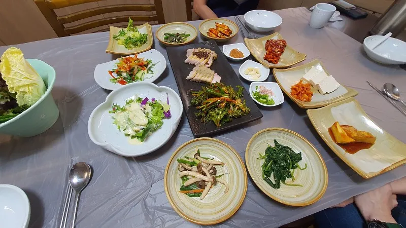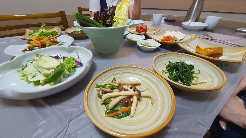 꿀과 흑임자로 곁들인 소스의 싱싱한 샐러드, 해초무침, 향까지 진하게 나는 나물들로 밑반찬이 참 풍성합니다.