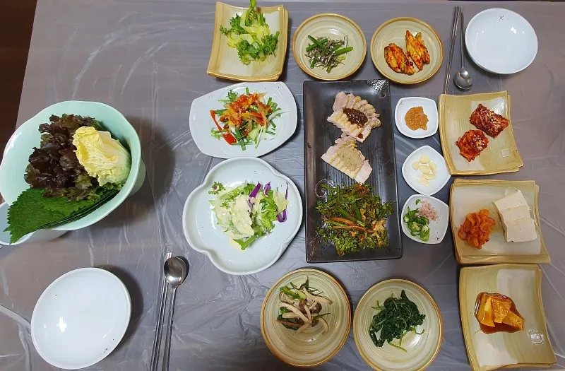 정갈한 반찬과 연잎밥의 조화, 일상에서 쉽게 먹을 수 있는 보쌈이 품격있어 보입니다.