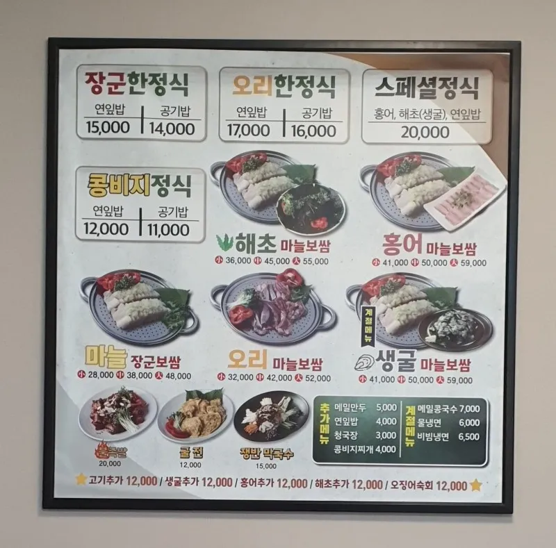 저희는 연잎밥 15,000원 정식을 주문해보았습니다. 사장님이 직접 주문을 받으시는데 푸근한 충청도 아저씨의 정성이 느껴지시는 인상이십니다. 그래서인지 장군 한정식에서 유명하다고 하는 마늘 보쌈도 궁금해져서 다음에 한번 더 방문하고 싶어집니다.