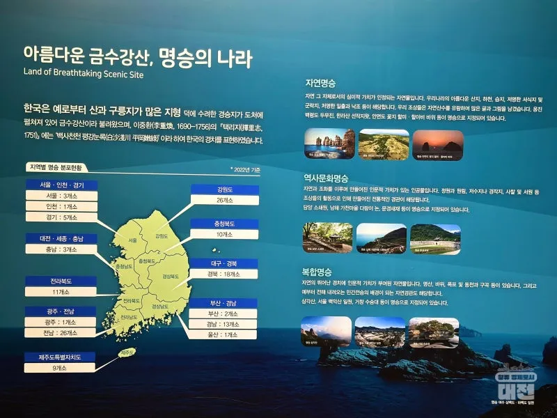 아름다운 금수강산, 명승의 나라 한국은 지역별 명승 분포 현황을 살펴볼 수 있고 체험 거리를 포함해서 아이들과 함께 볼 전시가 많