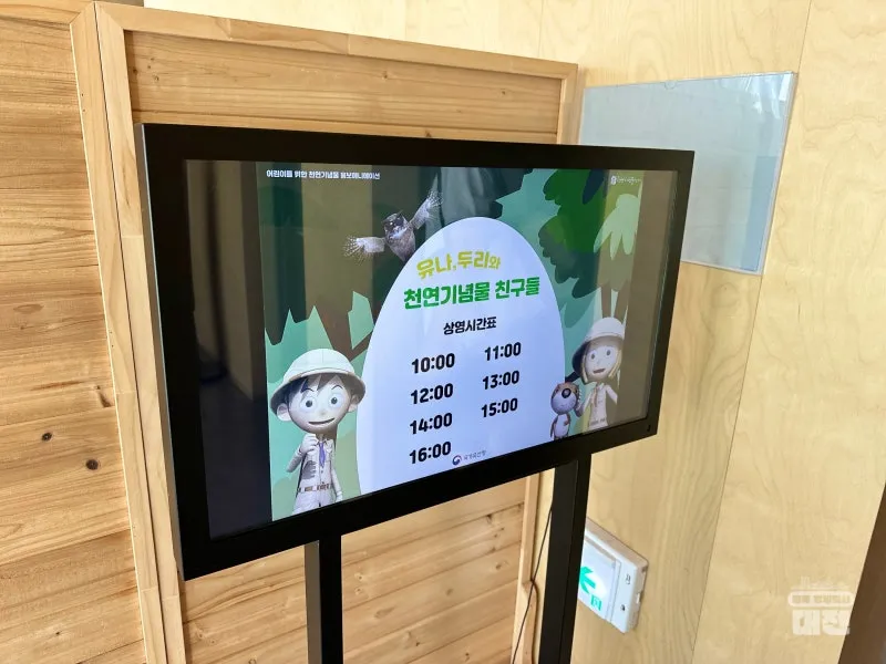 추가로 10:00부터 16:00까지 매 정각 '유나 두리와 천연기념물 친구들'이라는 주제로 영상까지 상영하기 때문에 실내에서 아이들과 추억 남기기에도 좋습니다. 대전 실내 가볼 만한 곳을 찾으신다면 천연기념물센터에 다녀오시는 건 어떤가요?