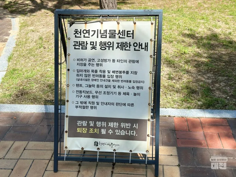 천연기념물센터 관람할 경우에는 입마개와 목줄 착용, 배변봉투를 지참하지 않은 반려동물 입장 행위와 취사 노숙 행위, 전동킥보드 탑승 등 관람 및 행위 제한 위반 시 퇴장 조치 될 수 있으니까 주의해 주시길 바랍니다.