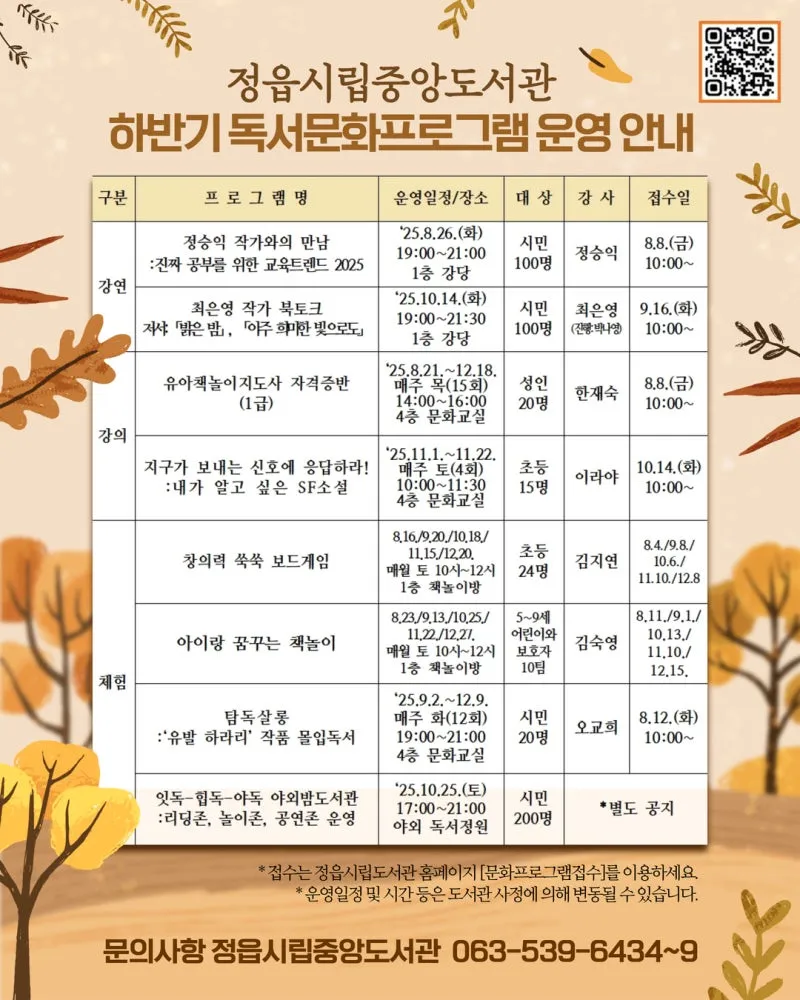 정읍시립중앙도서관 하반기 독서문화프로그램 운영 | 2025. 8. 8.(금) ~ 선착순 마감