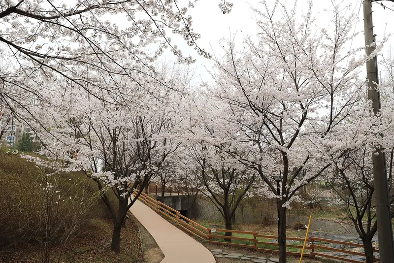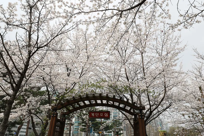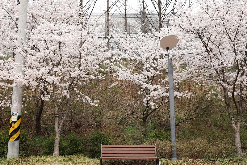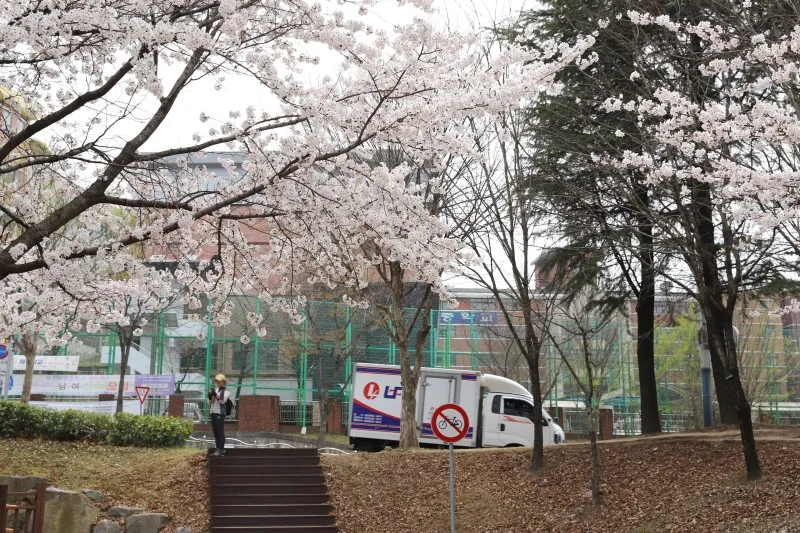 매봉초등학교 근처에 있는 만남의 마당에도 벚꽃으로 하얗게 둘러싸였습니다. 파란 하늘이었다면 더없이 아름다운 풍경이었을 텐데 살짝 아쉬움이 남습니다.