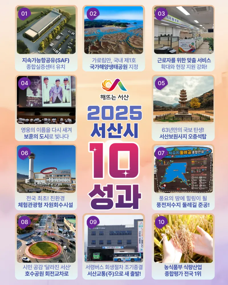 서산시, 2025년을 빛낸 ‘10대 성과’ 발표- 지속가능항공유 종합실증센터 유치·친환경 체험관광형 자원회수시설 준공 등 선정 -충남 서산시는 2025년을 빛낸 10대 성과사업을 선정했다고 9일 밝혔다. 시는 올해 45개 부서를 대상으로 성과를 접수했으며, 접수된 27개 사업을 대상으로 행정 전문가, 시민, 업무평가위원을 통한 평가 진행해 이번 10대 성과를 선정했다. 선정된 과제는 ▲전국 유일 지속가능항공유 종합실증센터 유치 성공 ▲친환경 체험관광형 자원회수시설 준공 ▲가로림만 국내 제1호 국가해양생태공원 지정 등이다. 시는 지속...