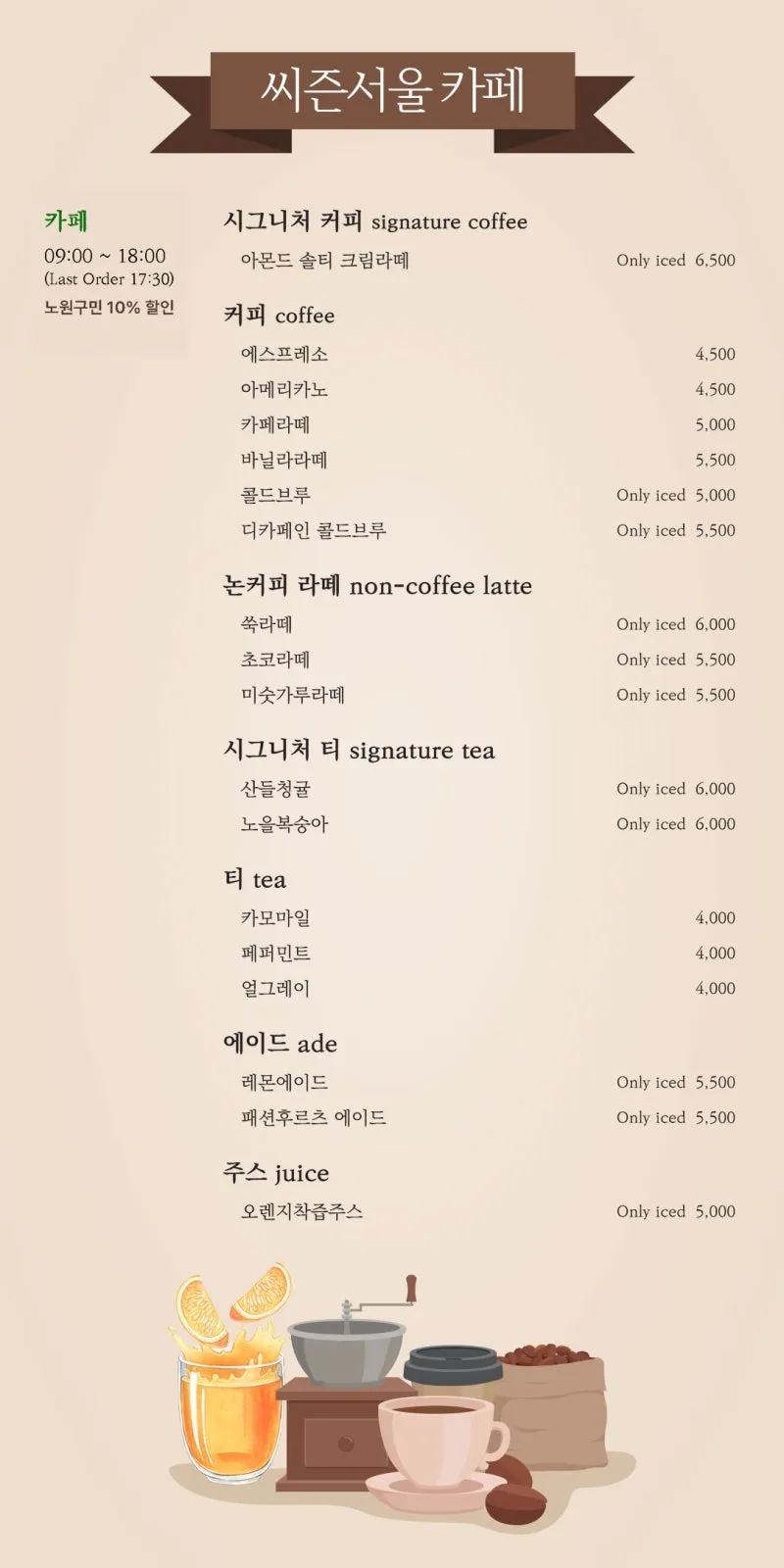 커피류 / 차 / 에이드 / 시그니처 음료류 / 베이커리 등 간식류 |