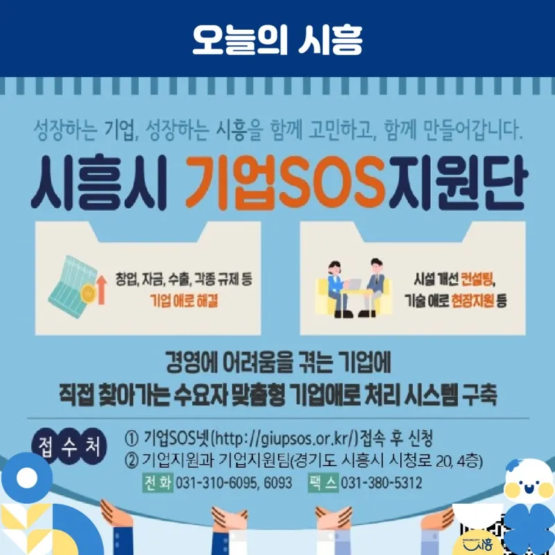 기업애로 상담이나 현장기동반의 방문을 희망하는 기업은 시흥시 기업지원과 기업지원팀(031-310-6093) 또는 ‘경기도 기업SOS넷(www.giupsos.or.kr)’을 통해서 신청하면 됩니다.