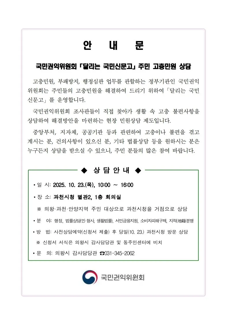 달리는 국민신문고, 의왕시민 고충민원 상담 안내