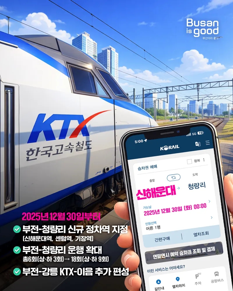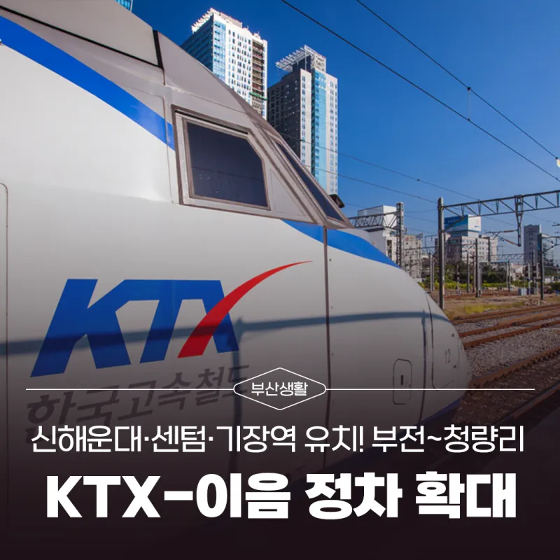 12월 30일부터 부산 부전역과 서울 청량리역을 잇는 KTX-이음 고속열차가 기장역, 신해운대역, 센텀역에 정차하며, 부산 시민의 수도권 접근성이 획기적으로 개선될 전망입니다.