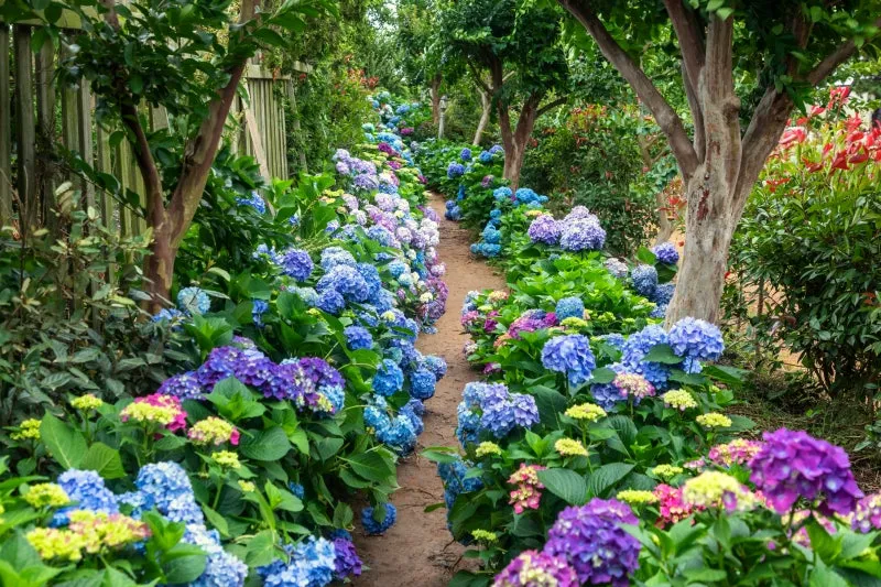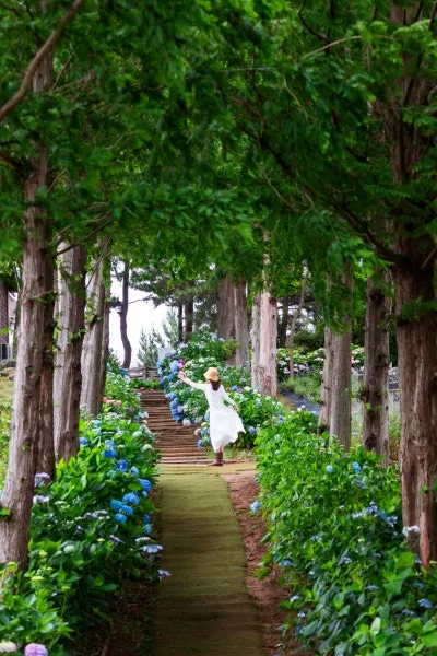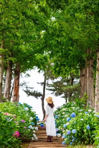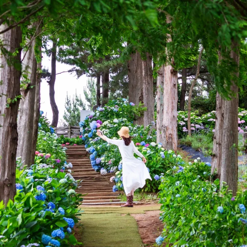 여름을 닮아 화려한 수국들이 길을 따라 펼쳐져 동화 속 풍경으로 들어온 듯한 태안 팜카밀레! 신비로운 빛으로 화려한 꽃을 틔운 이국적인 수국 풍경을 감상하며 여름꽃 축제의 아름다움을 여유롭게 담아보세요.