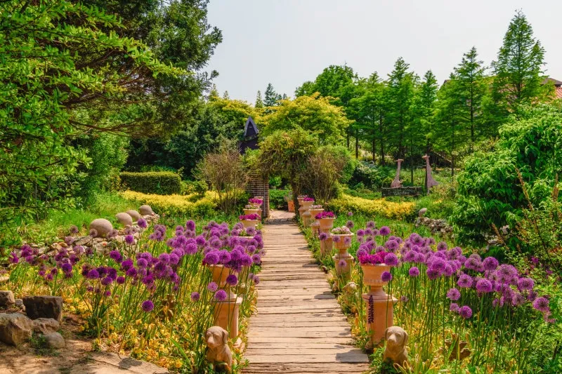 연꽃과 수련의 아름다움과 마음이 편안해지는 논뷰까지, 자연이 하나 되는 평안한 풍경을 볼 수 있는 태안 청산수목원! 그늘 아래에 놓인 나무 벤치에 앉아 풀 내음 잔뜩 머금은 시원한 바람을 맞으며 아름다운 여름꽃 축제의 풍경을 감상해 보세요.