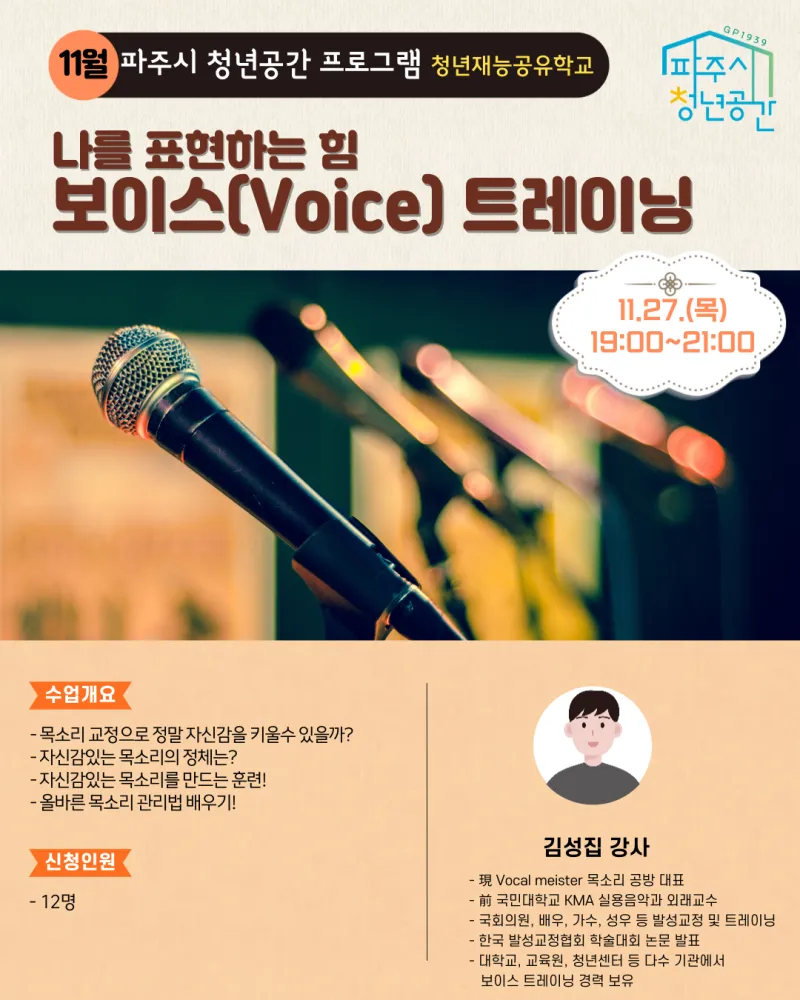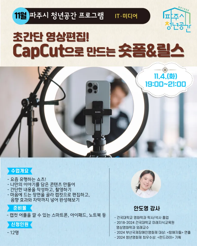 ✅ 신청대상 : 파주시 생활권인 만 19~39세 청년(고3 가능) / 12명