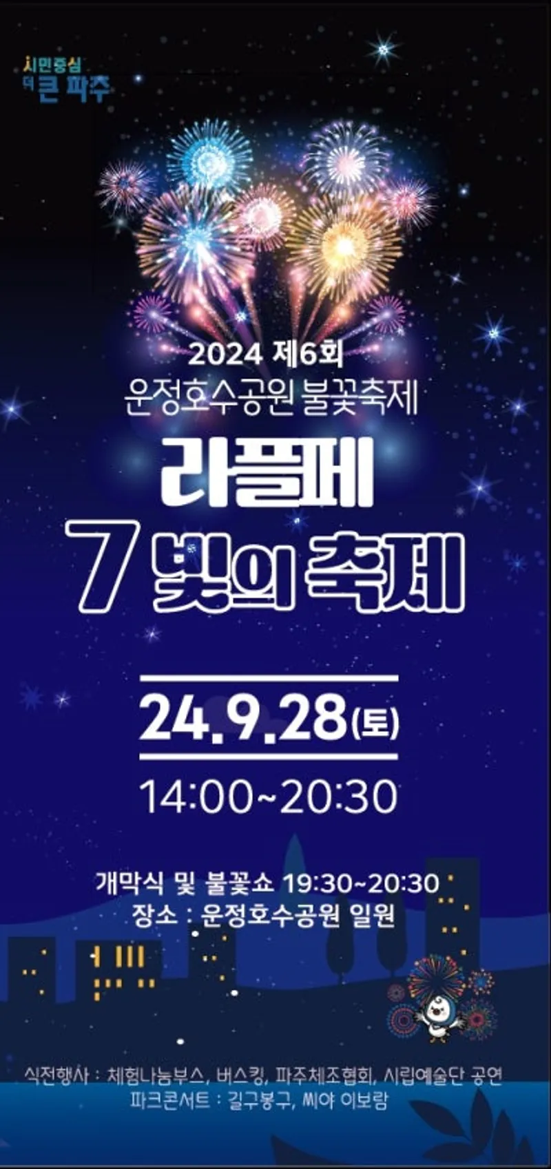 📆 2024. 9. 28.(토) 14:00 ~ 20:30 📌 개막식 및 불꽃쇼: 19:30 ~ 20:30 ✨ 장소: 운정호수공원 일원 |