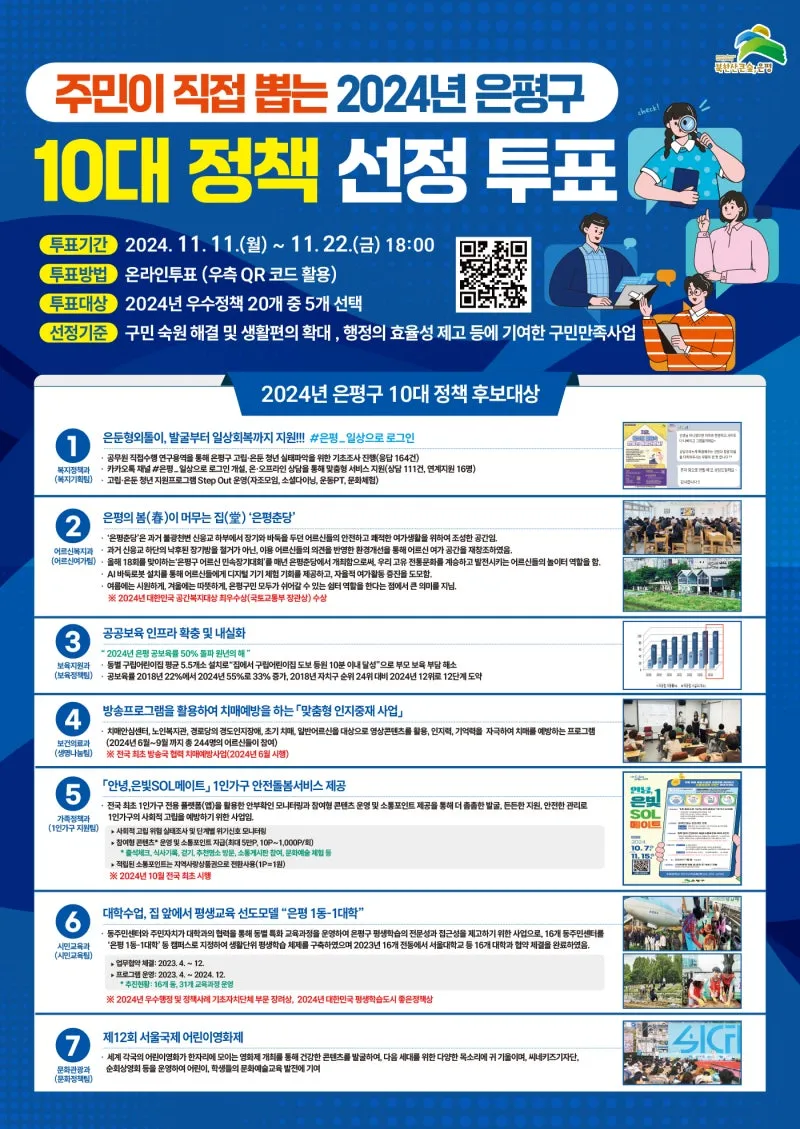 주민이 직접 뽑는 2024년 은평구 10대 정책 선정 투표 "여러분이 생각하는 은평구 우수 정책은?"