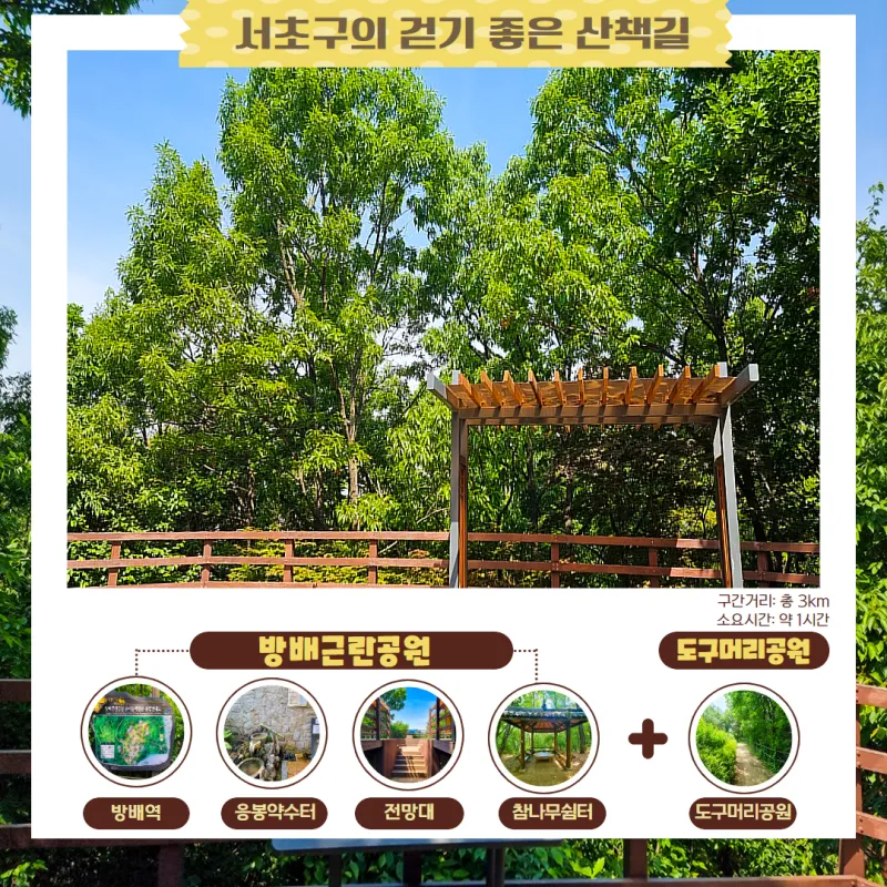 [방배역] 👉 [응봉약수터] 👉 [전망대] 👉 [참나무쉼터] ➕ [도구머리공원]으로 이어지는 코스로