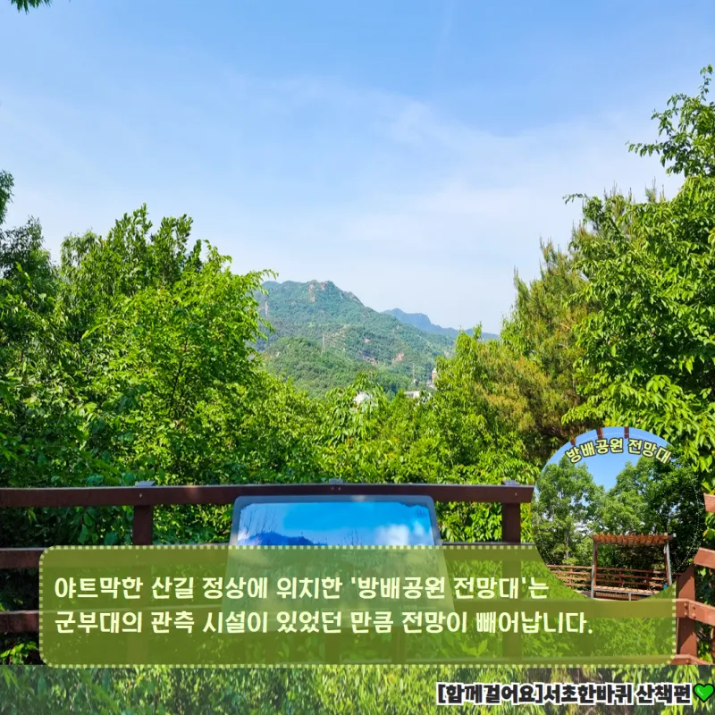 야트막한 산길 정상에 위치한 ‘방배공원 전망대’는 군부대의 관측 시설이 있었던 만큼 전망이 빼어납니다.