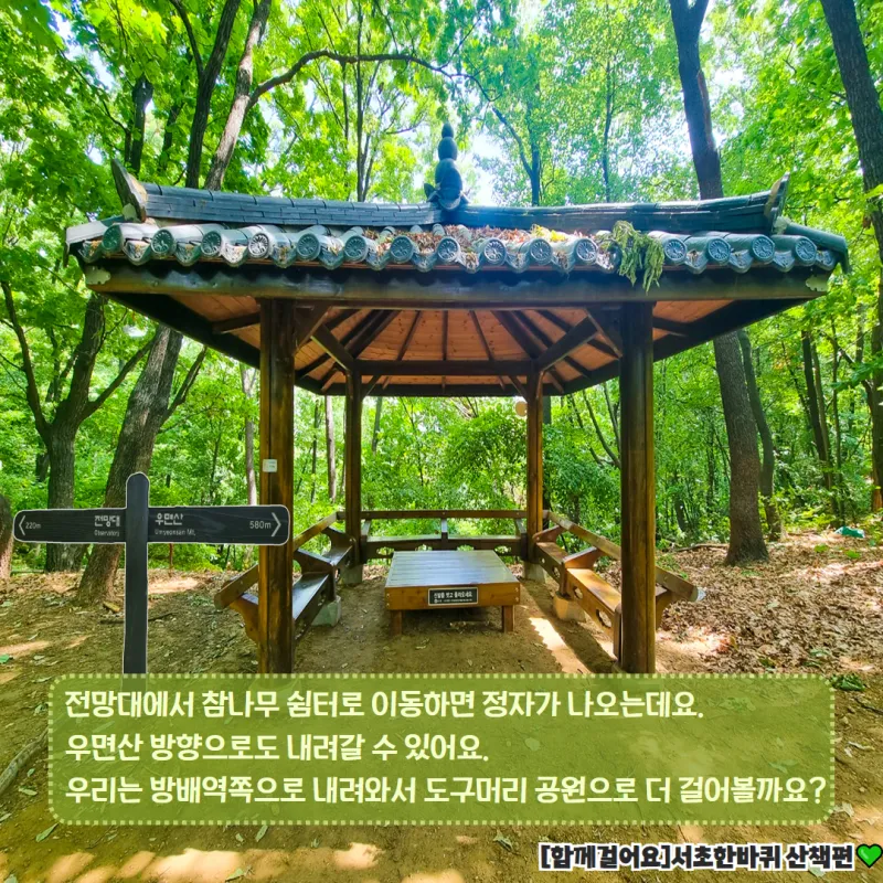 전망대에서 참나무 쉼터로 이동하면 정자가 있어요. 우면산 방향으로도, 방배역쪽으로도 내려갈 수 있는데요. 우리는 방배역쪽으로 내려와서 방배동의 또다른 산책길인 도구머리 공원으로 더 걸어가볼거예요.