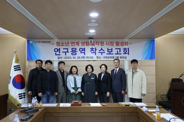 서천군의회 의원연구단체인 ‘청소년 연계 생활 밀착형 시장 활성화 연구모임(대표의원 홍성희)’이 지난 10월 26일 서천군의회 2층 회의실에서 연구용역 착수보고회를 개최했다.